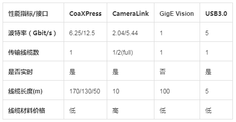 CoaXPress接口與其他幾種接口技術的比較列表: