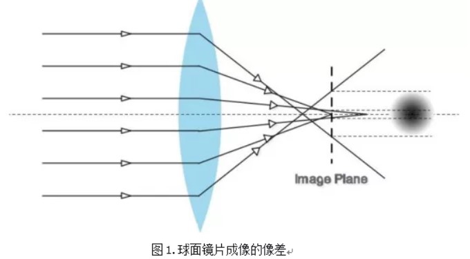 球面鏡片其鏡片呈球面的弧度,其橫切面亦呈弧狀。當(dāng)不同波長(zhǎng)的光線,以平行光軸入射后鏡片上不同的位置時(shí),在像方焦平面上不能聚焦成一點(diǎn),而形成像差的問(wèn)題(如圖1)